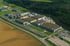 Luftaufnahme eines großen, modernen Bürogebäudes mit vielen Fenstern und flachem Dach, umgeben von Bäumen und Stadt.
